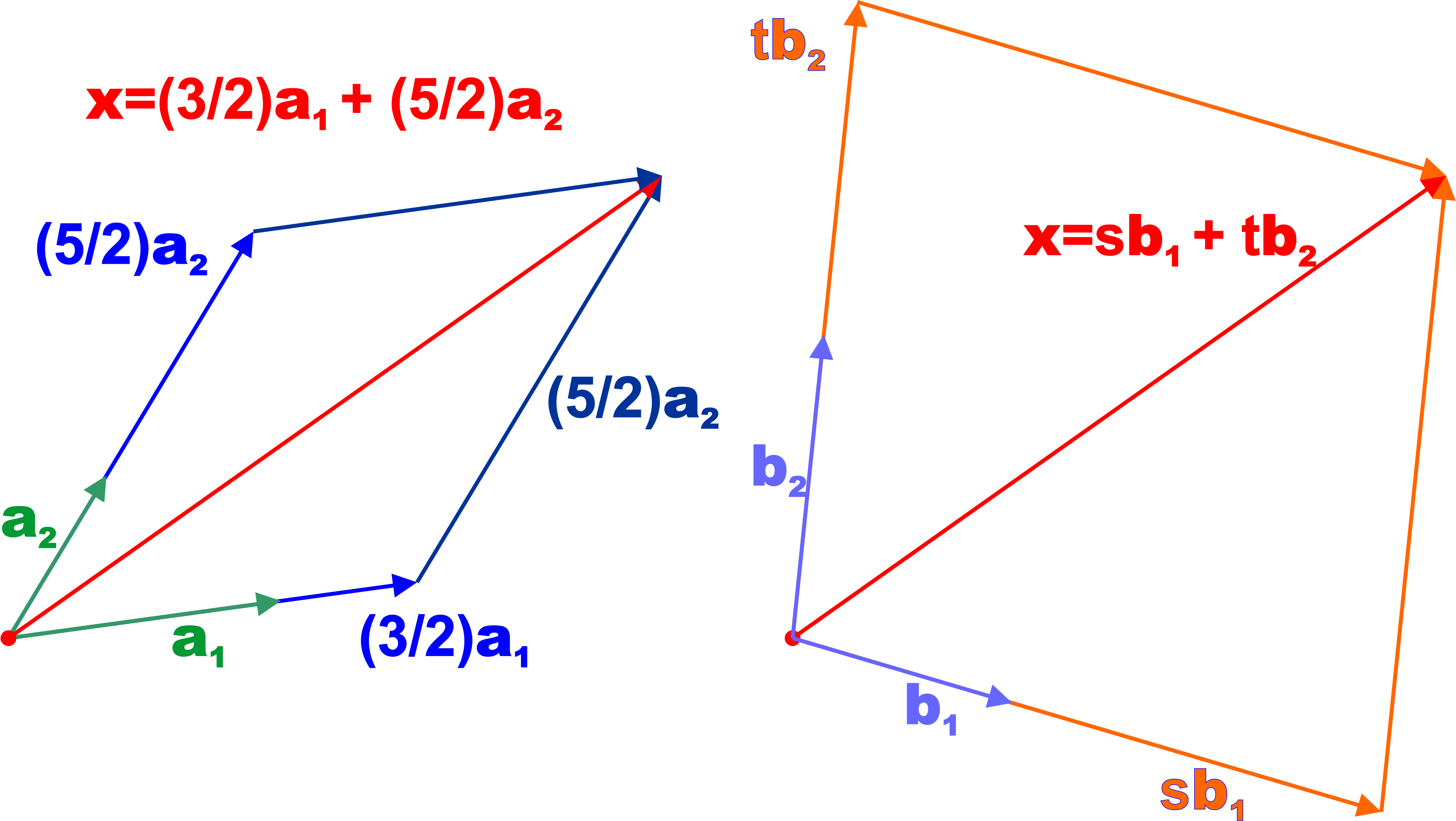 \[\Vect{x} = s \Vect{b}_1 + t \Vect{a}_2,\quad \text{and so}\quad \Vect{x}_{\EuScript{B}} = (s,t)\]The \(\EuScript{B}\)-coordinates of \(\Vect{x}\) are \((s,t)\)