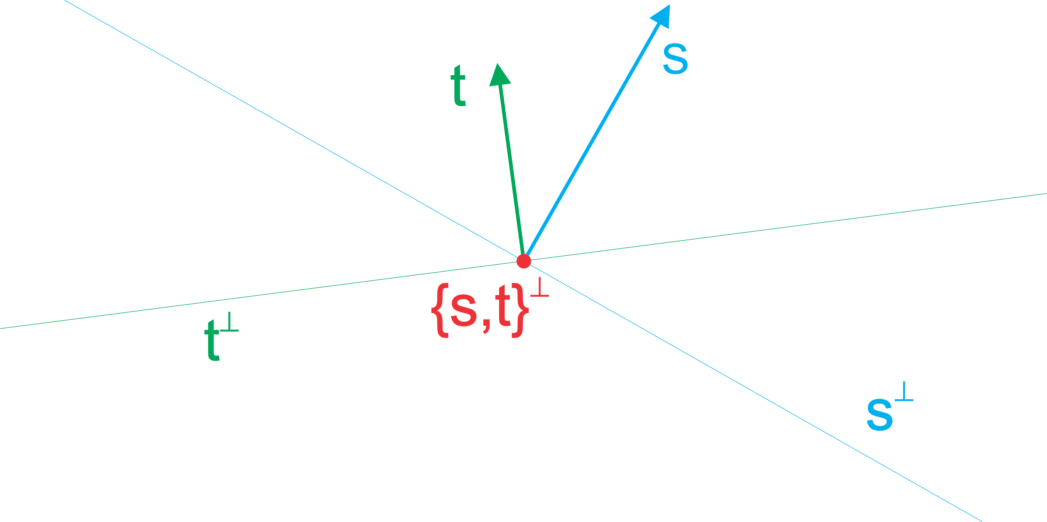 The picture below shows two vectors \(\Vect{s}\) and \(\Vect{t}\) in \(\RNrSpc{2}\), together with their respective orthogonal complements: