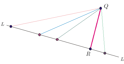 Given a line \(L\) in \(\RNrSpc{2}\) and a point \(Q\), there is always exactly one point \(R\) on \(L\) which is closest to \(Q\). So we define the distance from \(Q\) to the line \(L\) to be the distance from \(Q\) to \(R\).